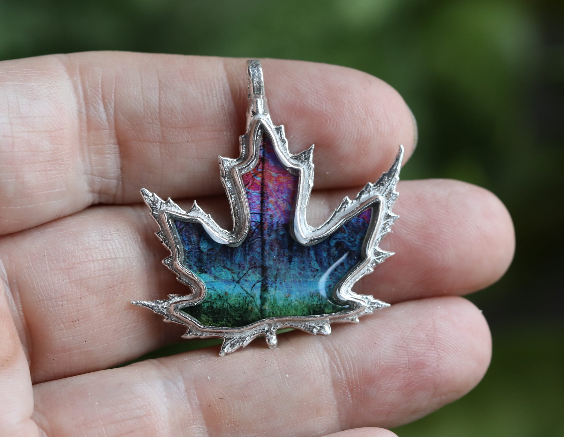 This Sterling Silver Maple Leaf is hand made from a 3D printed design and features a unique image I created by blending various photos and data from the Hubble Space Telescope. The captivating color pattern originates from the light reflected off soap film. It's an unforgettable piece of art that's sure to impress.
