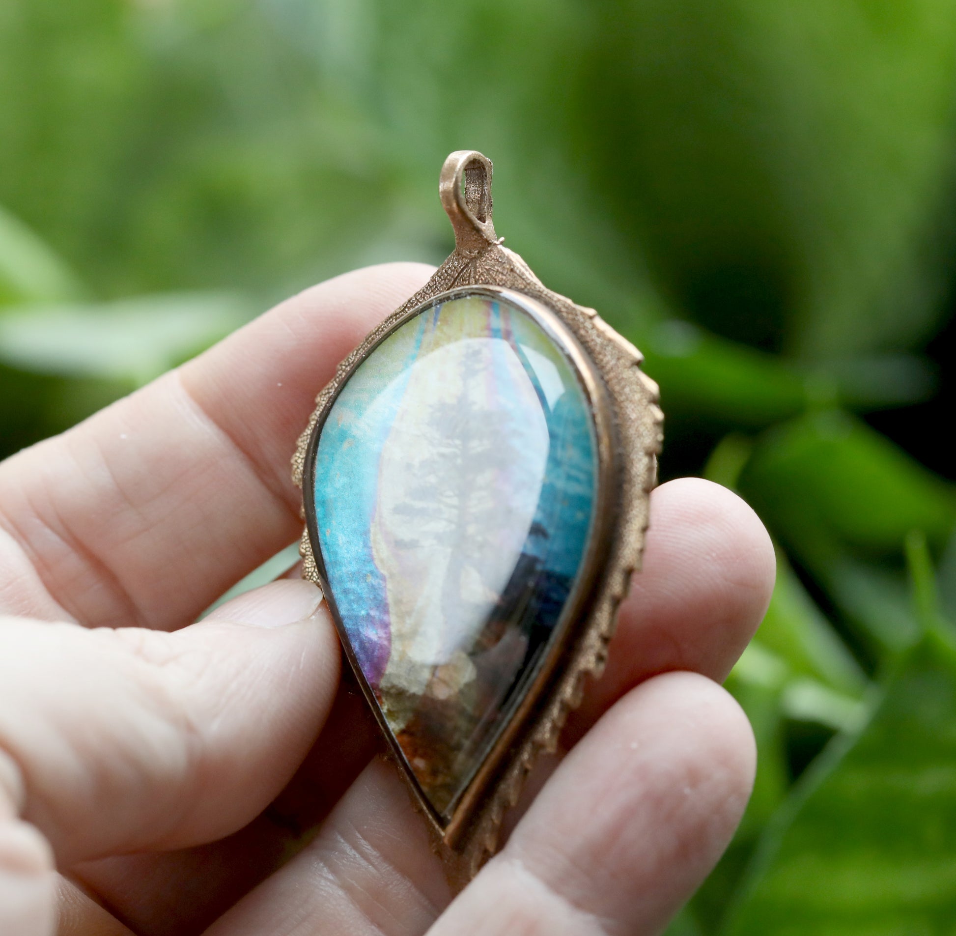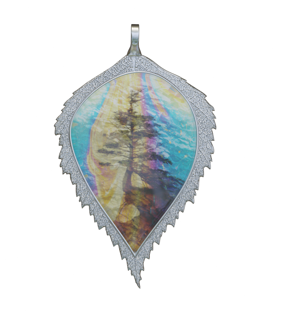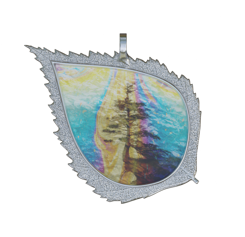 This Birch Leaf pendant is hand made from a 3D printed design and features a unique image I created by blending various photos I took. It's an unforgettable piece of art that's sure to impress.